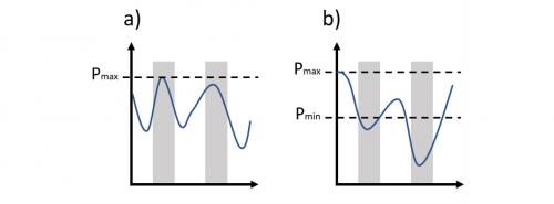 Wie in Abbildung 1 schematisch dargestellt, wird in Fall a) die maximale Stromspitze (Pmax) innerhalb eines Jahres zur Berechnung des Leistungspreises herangezogen. In Fall b) wird innerhalb der grau dargestellten Zeitfenster der Leistungsbezug reduziert. In diesem Fall kann außerhalb der Zeitfenster eine höhere Leistung vorliegen und dennoch wird die maximale Leistung innerhalb der Zeitfenster zur Berechnung des Leistungspreises angesetzt (hier: Pmin).