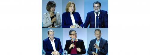 Auf dem BDEW-Kongress (von links oben nach rechts unten): Marie-Luise Wolff (Entega), Susanna Zapreva (Enercity), Wolfgang Schmidt (Bundeskanzleramt), Stefan Kapferer (50 Hertz), Nina Scheer (MdB SPD) und Thorsten Kramer (Leag)