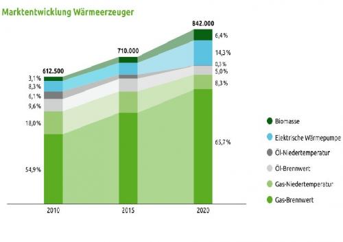 Marktanteile verschiedener Wärmeerzeuger zwischen 2010 und 2020 Bild: BDH - Zum Vergrößern bitte auf das Bild klicken. |