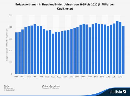 Die Statistik zeigt den Erdgasverbrauch in Russland in den Jahren von 1985 bis 2020. Die Werte sind in Milliarden Standardkubikmeter angegeben. Da die Daten mithilfe eines Standardumrechnungsfaktors direkt von Tonnen Öläquivalent abgeleitet wurden, entspricht die angegebene Menge nicht immer den in den jeweiligen Länderstatistiken genannten Gasmengen. Im Jahr 2020 belief sich der Erdgasverbrauch von Russland auf rund 411 Mrd. Kubikmeter. Quelle: BP Statistical Review of World Energy 2021