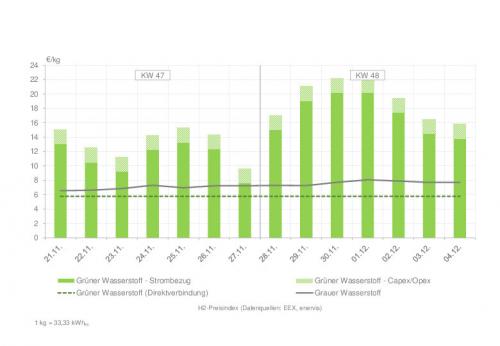 | Wasserstoffpreisindex für die Kalenderwochen 47 und 48 (zum Vergrößern bitte auf die Grafik klicken) Quelle: enervis energy advisors GmbH / EEX |