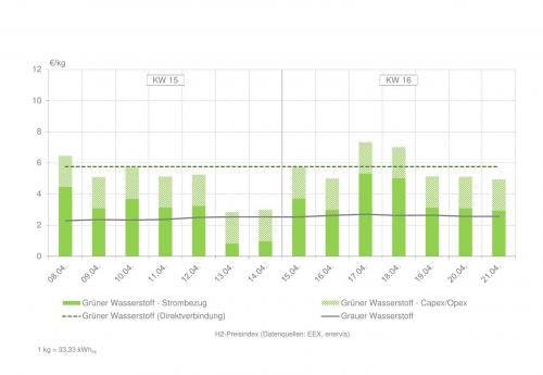 | Wasserstoffpreisindex in den Kalenderwochen 15 und 16 (zur Vollansicht bitte auf die Grafik klicken) Quelle: enervis energy advisors GmbH / EEX |