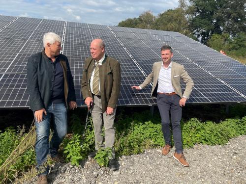 Mit 120 MWp ist einer der größten Photovoltaikparks im süddeutschen Raum nun komplett am Netz. Die Inbetriebnahme wurde am 17. September gefeiert (von rechts): Andreas Klier, Co-Geschäftsführer des Projektierers Anumar, Wolfgang Spengler, Ansprechpartner für Verpächter, und Verpächter Alexander von Zwehl freuten sich darüber, dass der Park nun in Gänze am Netz ist.