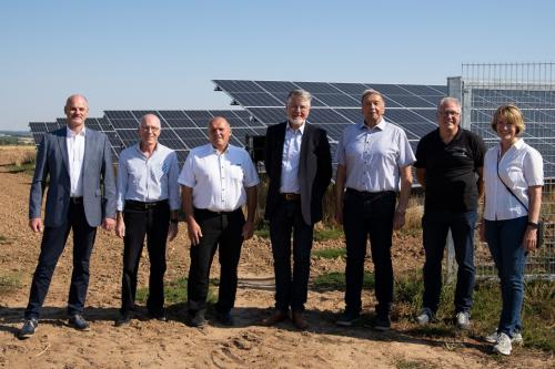 Eröffneten die Solarparks bei Martinsheim (von links): Norman Villnow (N-Ergie Regenerativ), Harald Kopp (Bürgermeister Marktbreit), Rainer Ott (Bürgermeister Martinsheim), Rainer Kleedörfer (N-Ergie), Robert Finster (stv. Landrat Kitzingen), Jochen Link (Energietechnik Link) und Anke Hormel (Landratsamt Kitzingen) Quelle: N-Ergie / Melissa Draa |