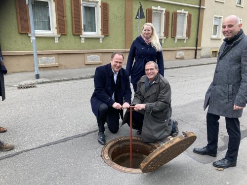 Bei der Inbetriebnahme der Verbindungsleitung (kniend von rechts nach links): Jörg Reichert (Energiedienst Holding AG) und Oberbürgermeister Klaus Eberhardt (SPD) Quelle: Energiedienst AG |