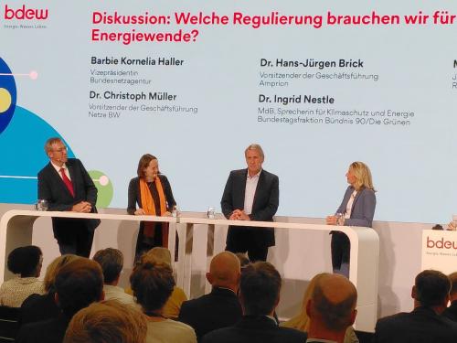 Diskussion zur Regulierung: (v.li.) Christoph Müller (CEO Netze BW), Ingrid Nestle (Grüne), Hans-Jürgen Brick (CEO Amprion) und Barbie Kornelia Haller (Vizepräsidentin Bundesnetzagentur) Quelle: E&M / S. Harmsen |