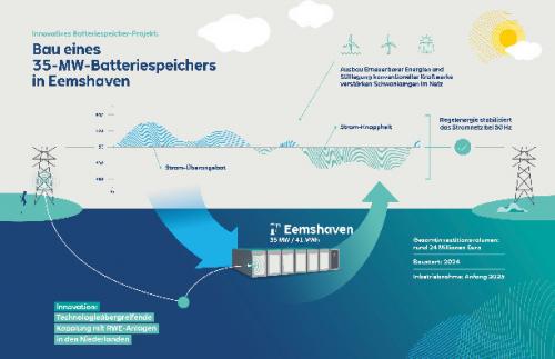 RWE hat den Bau seines ersten Großspeichers in den Niederlanden am Standort Eemshaven an der Nordseeküste gestartet. Auf einer Fläche von 3.000 Quadratmetern werden 110 Schränke mit Lithium-Ionen-Batterien installiert. Diese verfügen insgesamt über eine Leistung von 35