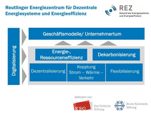 Das REZ lehrt und forscht zu Lösungen und Geschäftsmodellen im Bereich Energie-, Ressourceneffizienz, Dezentralisierung und Sektorenkopplung. Dazu gehören dezentrale Kraftwerkstechnik, KWK, Wärme-, Stromspeicher, E-Mobilität, Mikronetze, elektrische Antriebe, Energie- & Materialeffizienz, Distributed ledger Technologien, Virtuelle Kraftwerke, Wasserstoff, Akzeptanz und Nachfrageverhalten Prosumer-, Community-Lösungen, Unternehmertum, Innovation und Klimaneutralität.