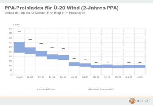Der aktuelle PPA-Preisindex bildet jeweils Verträge mit einem Startdatum im August 2023 ab. Aus dem Markt ist aktuell nach Auslaufen der Strompreisbremse vor allem bei Wind-Kurzfrist-PPA wieder eine steigende Nachfrage zu sehen, teilt Enervis mit.