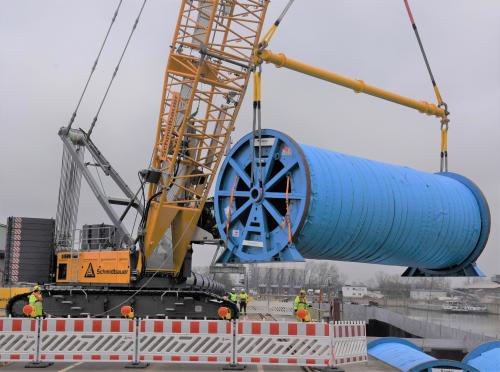 Verladung der Südostlinkkabel im Regensburger Industriehafen. Jede Trommel enthält 1.740 Meter Leitung und wiegt 80 Tonnen
