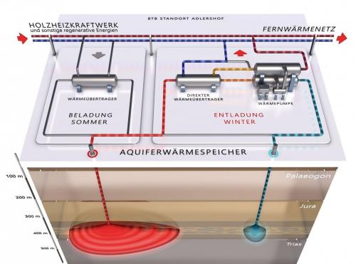 Schematische Darstellung der Funktion des Aquiferspeichers der BTB in Berlin-Adlershof Quelle: BTB |