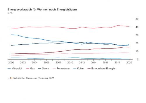 Energieverbrauch fürs Wohnen nach Energieträgern von 2000 bis 2020 (Zum Vergrößern bitte auf die Grafik klicken) Quelle: Destatis |
