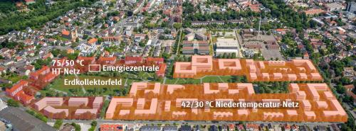 Die Energieversorgungs-Anlagen wurden auf das Quartier zugeschnitten, denn sie müssen sowohl neue Wohnungen und Gebäude als auch den denkmalgeschützten Gebäudebestand aus dem 19. Jahrhundert effizient versorgen. Planer und Wärmenetzbetreiber haben sich nach Abwägung der möglichen Optionen für ein Konzept mit Nieder- und Hochtemperaturnetz sowie Wärmepumpen und einem Blockheizkraftwerk entschieden.