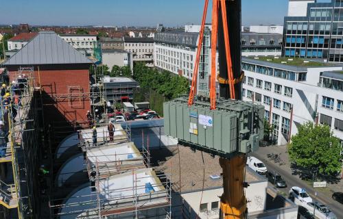Millimeterarbeit mit 55 Tonnen am Haken: Ein Autokran hebt einen von drei Transformatoren ins neue Umspannwerk Rollberg in Berlin. Über eine Öffnung im Dach werden die Schwergewichte an ihren Platz gebracht. Sie ist nur wenige Zentimeter größer als die Transformatoren selbst mit einer Länge von 5,80 und einer Breite von 3,20
