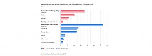 | Stromeinspeisung durch erneuerbare und konventionelle Energieträger im dritten Quartal 2025 im Vergleich zum Vorjahresquartal (zur Vollansicht bitte auf die Grafik klicken) Quelle Statistisches Bundesamt |