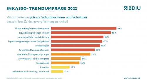 Befragt nach den Gründen, warum private Schuldnerinnen und Schuldner Rechnungen nicht gezahlt haben, ist die Inflation aber bereits ein wichtiger Faktor. Jedes zweite Inkassounternehmen berichtet, dass durch die Kostensteigerungen ausgelöste Liquiditätsengpässe in diesem Jahr ein häufiger Grund für ausgebliebene Zahlungen waren.
