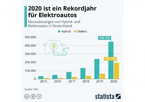 Die Zahl der Neuzulassungen von Elektroautos in Deutschland hat 2020 einen neuen Rekordwert erreicht. Wie das Kraftfahrt-Bundesamt (KBA) mitteilte, gab es im vergangenen Jahr 446.756 Neuzulassungen von Pkw mit Hybrid-Antrieb. Das sind fast 208.000 Fahrzeuge mehr als noch im Jahr zuvor. Die Anzahl der Neuzulassungen von Pkw mit reinem Elektro-Antrieb hat sich im Vorjahresvergleich sogar fast verdreifacht, wie die Statista-Grafik zeigt. Auch der Ausbau der Ladestationen wurde weiter vorangetrieben. Deutschlandweit gibt es nun 21.746 Ladestationen für Elektroautos.
