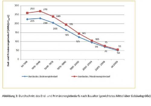 | Durchschnitt des End-und Primärenergiebedarfs von Gebäuden nach Baujahr Grafik: Dena |