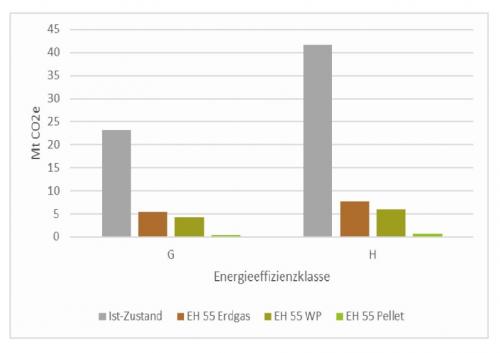 THG-Emissionen in den Effizienzklassen G und H heute und nach einer hypothetischen Sanierung auf EH 55-Standard Grafik: Ifeu |