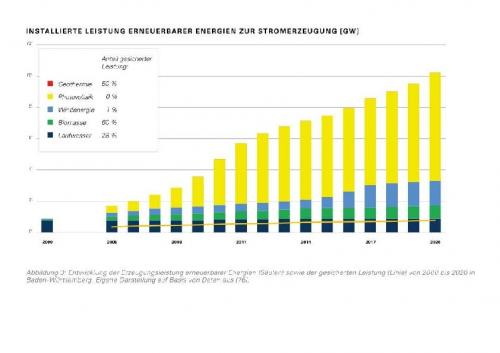 Entwicklung der installierten Leistung zur erneuerbaren Stromerzeugung in Baden-Württemberg von 2000 bis 2020 (zum Vergrößern bitte auf das Bild klicken) Quelle: Umweltministerium BaWü |