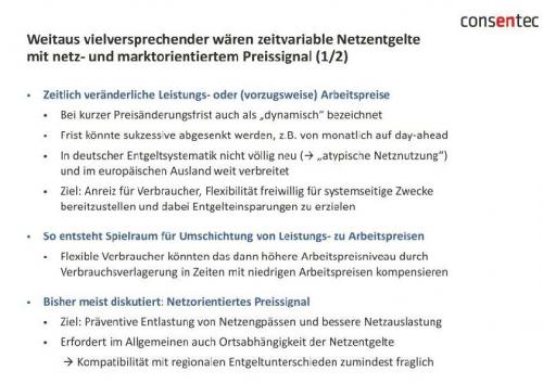 Eine zeitabhängige Ausgestaltung der Netzkosten könnte dagegen den effizienten Strombezug anreizen. Zudem würde die für ein Stromsystem basierend auf Erneuerbaren Energien nötige Flexibilität auf Verbraucherseite kostensparend gefördert. Um die Gesamtkosten des neuen Systems durch Anreize zu optimieren, muss der bisherige Fokus auf eine Verursachungsgerechtigkeit überwunden werden.