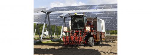 Ein Traktor fährt unter einer Agri-PV-Anlage durch Quelle: Agrosolar Europe GmbH |