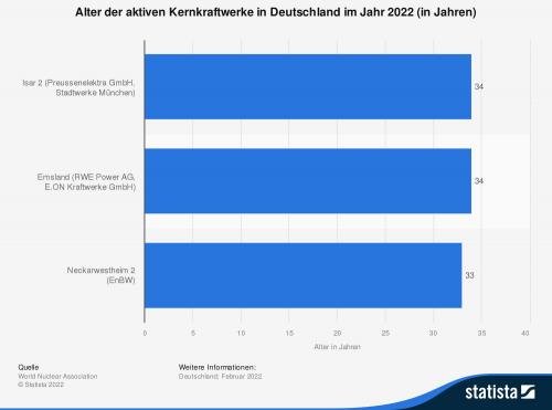Die Statistik zeigt das Alter der drei aktiven Kernkraftwerke in Deutschland im Jahr 2022. Das in Niederbayern gelegene Kernkraftwerk Isar 2 erzeugt seit 1988 Strom und ist demzufolge 34 Jahre alt. Die Angaben beruhen auf Daten der World Nuclear Association, einer internationalen Lobbyorganisation.