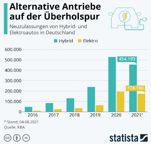 Mit den Neuzulassungen im Juli erreichen die E-Autos in Deutschland einen Meilenstein: Laut Kraftfahrt-Bundesamt (KBA) sind jetzt mehr als eine Million Autos mit Elektroantrieb auf deutschen Straßen unterwegs. 54 Prozent davon sind rein elektrisch betrieben, 46 Prozent sogenannte Plug-in-Hybride, deren Akkus sowohl über das Stromnetz als auch den Benzinmotor geladen werden können.