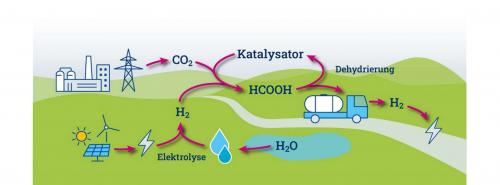 CO2 reagiert mit regenerativ erzeugtem Wasserstoff (H2) mithilfe eines Katalysators zu Ameisensäure (HCOOH). So kann Wasserstoff langfristig und mit weniger Aufwand gespeichert, gelagert und transportiert werden. Vor der Rückverstromung wird der Wasserstoff mithilfe eines Katalysators aus der Ameisensäure freigesetzt. Das abgetrennte CO2 wird anschließend zurückgeführt, um erneut mit Wasserstoff verbunden zu werden und Ameisensäure zu bilden.
