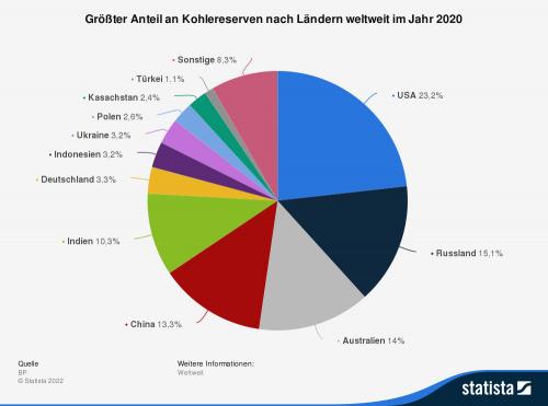 Die Statistik zeigt den größten Anteil an den nachgewiesenen Kohlereserven nach Ländern weltweit im Jahr 2020. Zu den nachgewiesenen Kohlereserven zählen laut Quelle im Allgemeinen Mengen, die nach geologischen und ingenieurtechnischen Informationen aller Wahrscheinlichkeit nach aus den heute bekannten Vorkommen und unter den derzeitigen wirtschaftlichen und technischen Bedingungen künftig gefördert werden können. Quelle: BP Statistical Review of World Energy