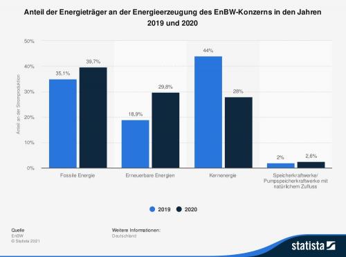 Die Statistik zeigt den Anteil der Energieträger an der Energieerzeugung des EnBW-Konzerns in den Jahren 2019 und 2020. Im Jahr 2020 wurden rund 30 Prozent der erzeugten Energie des EnBW-Konzerns aus erneuerbaren Energieträgern gewonnen - ein starker Anstieg im Vergleich zum Vorjahr.