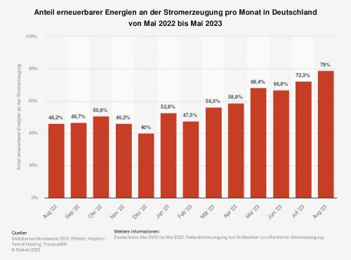 Im Juli 2023 betrug der Anteil erneuerbarer Energien an der Stromerzeugung in Deutschland rund 79 Prozent.