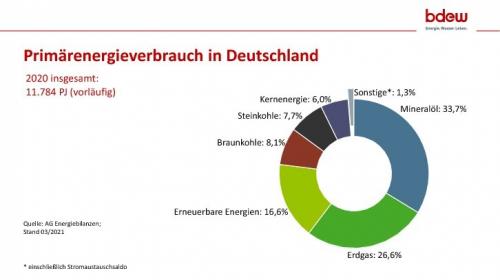 16,6 % des Primärenergieverbrauchs in Deutschland wurden im Jahr 2020 durch erneuerbare Energien gedeckt. Im 1. Quartal des aktuellen Jahres sei die Quote vergleichbar gewesen, so der Bundesverband der Energie- und Wasserwirtschaft (BDEW) in einer Statistik. Als Primärenergie werden alle Energien bezeichnet, die in ihrer Ursprungsform zum Beispiel als Windenergie, Erdgas, Braunkohle oder Kernenergie vorkommen. Sie können in andere Energieträger wie Strom oder Wärme (Sekundärenergie) umgewandelt werden.