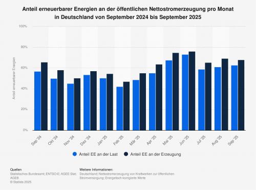 Im September 2025 betrug der Anteil erneuerbarer Energien an der Stromerzeugung in Deutschland rund 68 Prozent. Der Anteil erneuerbarer Energien an der Last lag derweil bei rund 63 Prozent. Onshore-Windkraft hat hierzulande den größten Anteil an der Stromerzeugung aus erneuerbaren Energien.