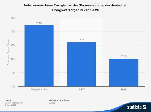Die Statistik zeigt den Anteil erneuerbarer Energien an der Stromerzeugung der großen deutschen Energieversorgungsunternehmen im Jahr 2020. Im Jahr 2020 wurden rund 44,8 Prozent des erzeugten Stroms der deutschen Vattenfall GmbH aus erneuerbaren Energieträgern gewonnen.