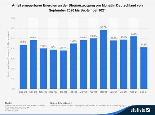 Die Statistik zeigt den monatlichen Anteil erneuerbarer Energien an der Stromerzeugung in Deutschland von September 2020 bis September 2021. Im September 2021 betrug der Anteil erneuerbarer Energien an der Stromerzeugung rund 41,5 %. Der Durchschnittswert für das Jahr 2021 lag bei insgesamt 47,9 %.