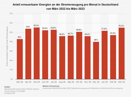 Die Statistik zeigt den monatlichen Anteil erneuerbarer Energien an der Stromerzeugung in Deutschland von März 2022 bis März 2023. Im März beträgt der Anteil erneuerbarer Energien an der Stromerzeugung in Deutschland rund 55,2 Prozent. Der Durchschnittswert für das Jahr 2022 lag bei insgesamt 49,8 Prozent.