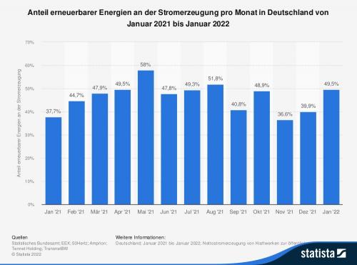 Die Statistik zeigt den monatlichen Anteil erneuerbarer Energien an der Stromerzeugung in Deutschland. Im Januar 2022 betrug er rund 49,5 %. Der Durchschnittswert für das Jahr 2021 lag bei insgesamt 45,7 %.