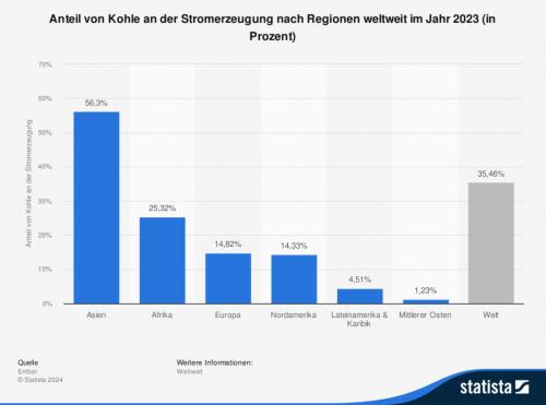 Kohle spielt nach wie vor eine bedeutende Rolle bei der Stromerzeugung weltweit, wobei Asien mit einem Anteil von über 56 Prozent an der Spitze steht. Insgesamt beträgt der Anteil von Kohle an der Stromerzeugung weltweit rund 35 Prozent.