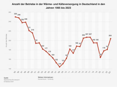 Die Statistik zeigt die Anzahl der Betriebe in der Wärme- und Kälteversorgung in Deutschland in den Jahren 1995 bis 2023 nach Zahlen des Statistischen Bundesamtes. Im Jahr 2023 waren 204 Betriebe in der deutschen Wärme- und Kälteversorgung tätig.