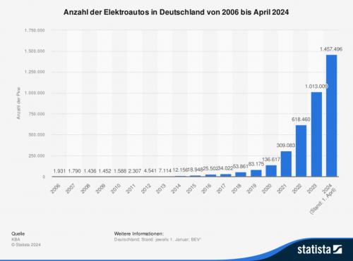 Die Anzahl an zugelassenen Elektroautos in Deutschland überstieg Ende des Jahres 2022 erstmals die Millionenmarke. Bis zum 1. April 2024 stieg die Zahl weiter auf insgesamt rund 1,46 Millionen Fahrzeuge. Abgebildet werden Pkw mit ausschließlich elektrischer Energiequelle (BEV).
