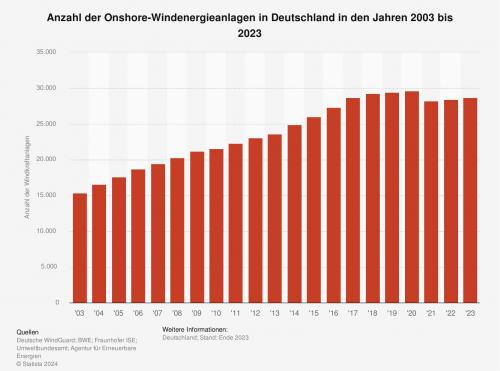 Im Jahr 2023 befanden sich nach an Angaben von Umweltbundesamt, Agentur für Erneuerbare Energien, BWE, Fraunhofer ISE und Deutsche WindGuard in Deutschland 28.677 Windenergieanlagen an Land. Die sogenannten Onshore-Windenergieanlagen waren überwiegend in Niedersachsen, Brandenburg, Nordrhein-Westfalen und Schleswig-Holstein zu finden. Am wenigsten derartiger Anlagen befanden sich zuletzt in den Stadtstaaten Berlin, Hamburg und Bremen sowie im Saarland.