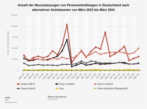 Die Anzahl der Neuzulassungen von Personenkraftwagen mit alternativen Antrieben stieg nach Angaben des Kraftfahrtbundesamtes im März 2024 im Vergleich zum Vormonat auf insgesamt etwa 115.700 Fahrzeuge an. Damit machten die alternativen Antriebe etwa 44
