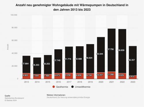 Im Jahr 2023 wurden nach Angaben des Statistischen Bundesamtes in Deutschland mehr als 46.000 Wohngebäude mit Wärmepumpen, basierend auf Umweltthermie, genehmigt. Ein Jahr zuvor betrug die Anzahl noch rund 70.000 Stück.
