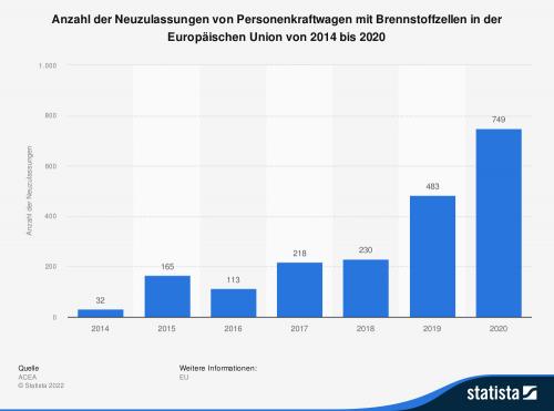 Im Jahr 2020 wurden laut Zahlen der European Automobile Manufacturers' Association (ACEA) in Europa insgesamt rund 749 PKW mit Brennstoffzellen (FCEV - Fuel Cell Electric Vehicle) neu zugelassen. Im Vergleich zum Vorjahr entspricht das einem Zuwachs von 266