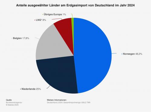 Deutschland bezieht nach Angaben der Bundesnetzagentur den Großteil seiner Erdgasimporte vornehmlich aus drei Ländern. Dabei ist Norwegen im Jahr 2024 mit einem Anteil von 48