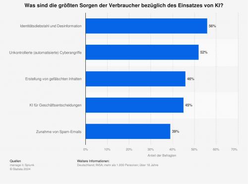 Mehr als die Hälfte der Befragten (56 Prozent) sind besorgt darüber, dass der Einsatz von KI zu einem Anstieg von Identitätsdiebstahl und Desinformation durch gefälschte Nachrichten oder Bilder führen könnte. Zudem glauben 52 Prozent, dass es zu einer Zunahme von unkontrollierten (automatisierten) Cyberangriffe kommen wird. 45 Prozent der Befragten äußerten Bedenken, dass KI in Zukunft für wichtige Geschäftsentscheidungen verwendet wird.