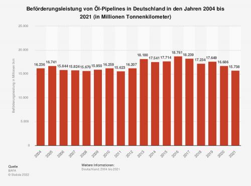 Die Statistik zeigt die Höhe der Beförderungsleistung von Öl-Pipelines in Deutschland in den Jahren 2004 bis 2021 nach Zahlen des Bundesamtes für Wirtschaft und Ausfuhrkontrolle. Im Jahr 2021 wurde eine Beförderungsleistung von rund 15,7