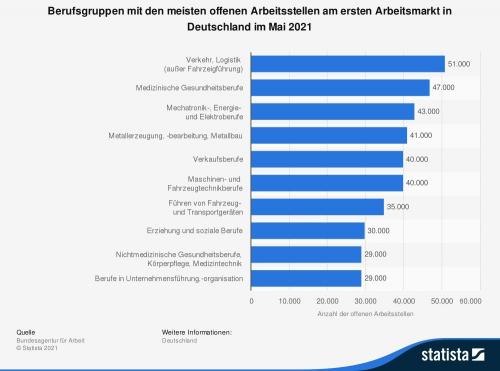 Die Gesamtzahl der gemeldeten offenen Arbeitsstellen in Deutschland betrug im Mai 2021 etwa 654.000. Das waren 12 Prozent mehr als im gleichen Monat des vorherigen Jahres.