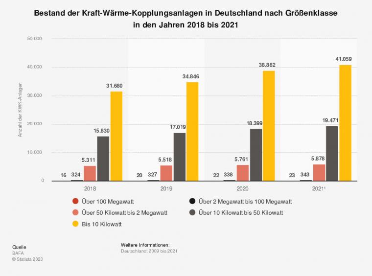 Durch Kraft-Wärme-Kopplung (KWK) sollen Brennstoffe in Energiegewinnungsanlagen effizienter genutzt werden, indem neben Elektrizität auch Wärme für Haushalte bereitgestellt wird. Diese Anlagen wurden mit dem KWK-Gesetz gefördert. Von 2009 bis 2021 wurden nach Angaben des Bundesamt für Wirtschaft und Ausfuhrkontrolle (BAFA) 66.774 KWK-Anlagen gebaut − davon 23 Anlagen, die mehr als 100 MW produzieren.